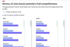 이란 전쟁 장기화로 글로벌 해운업계가 하루 3억 4000만 유로 규모의 추가 비용을 떠안고 있다. 유럽의 환경단체 T&E(Transport & Environment)가 30일 발표한 보고서에 따르면 전 세계 선대의 99%가 화석연료 기반으로 추진되며, 이에 따른 구조적 취약성이 이번 전쟁에서 그대로 드러났다. 보고서에 따르면 싱가포르 벙커시장에서 VLSFO(Very Low Sulphur Fuel Oil) 가격은 올해 초 대비 223% 급등한 톤당 941유로를 기록했다. 또한 LNG 가격도 3월 초 이후 72% 상승했다. T&E는 이에 따라 2월 28일 이후 해운업계가 부담한 추가 연료비가 46억 유로에 달한다고 밝혔다. T&E 해운정책 책임자인 엘로이 노르데(Eloy Norde)는 이란 전쟁이 해운업계에 미치는 영향은 단순한 운항 차질을 넘어 '비용 폭탄'으로 이어지고 있다고 지적했다. 그러면서 T&E는 유럽 정책당국에 해운업은 대체연료인 전기추진을 통해 외부 충격에 덜 흔들리는 구조로 전환해야 한다고 촉구했다. 구체적으로 녹색 전기 생산 지원, FuelEU Maritime 목표 강화, 에너지 효율 투자 확대 등이다. 노르데는 “이번 위기는 유럽이 녹색 전기산업에 더 과감하게 투자해야 한다는 신호"라며 "전기는 지역 생산이 가능해 지정학적 충격을 줄이고 에너지 안보를 강화한다"고 지적했다. 한편 T&E 분석에 따르면 이란 전쟁 이후 화석연료 중 비싼 편인 MGO와 전기 간 비용 격차는 일부 항만에서 5% 수준까지 접근했다. T&E는 EU 페리(Ferry)의 경우 전체의 20%는 이미 전기추진이 화석연료보다 더 저렴하며 원양 상선에 현대식 풍력보조기술을 적용할 경우 최대 18%의 연료비 절감이 가능하다고 주장했다.