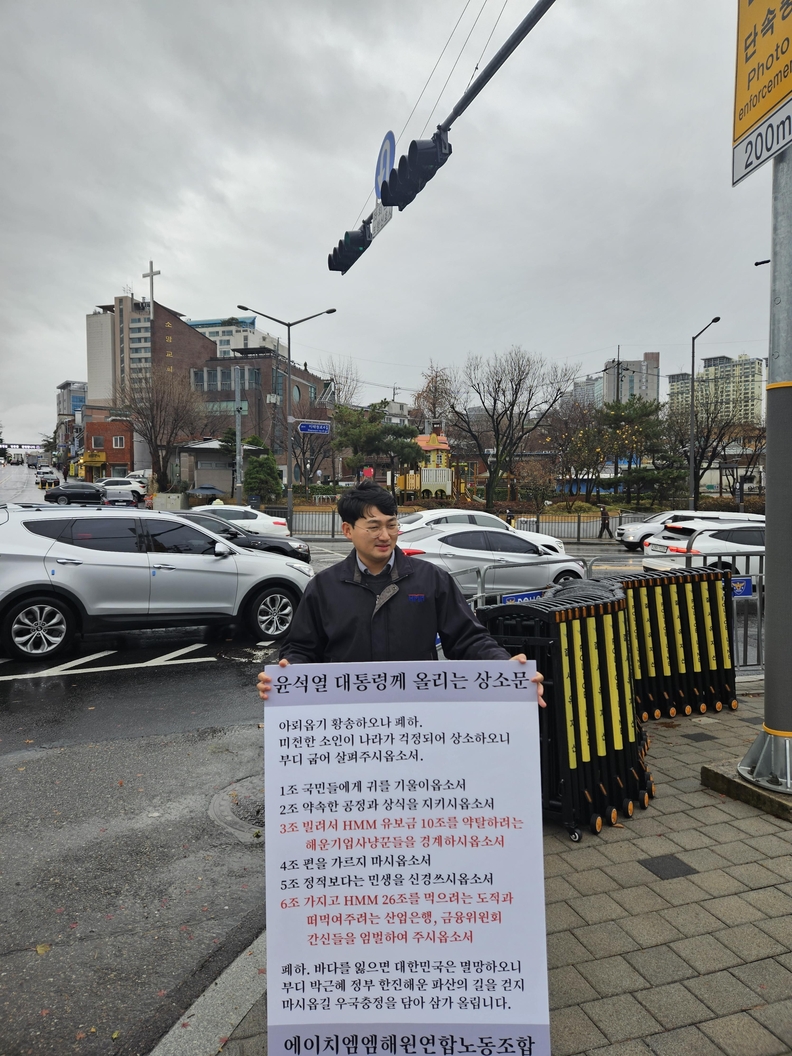 전정근 HMM해원연합노동조합 위원장이 11일 오후 용산 대통령실 앞에서 HMM 매각 재검토를 요청하는 1인 시위를 펼쳤다. 전 위원장은 추후 대통령실 앞 1인 시위, 준법 투쟁, 파업권 확보 등 투쟁 강도를 높여간다는 계획이다.