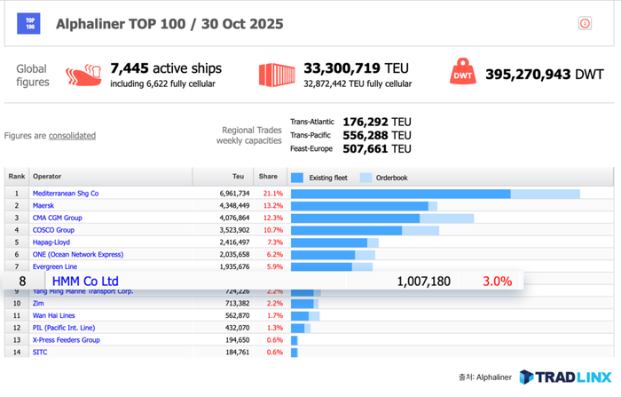 또 정기선 시황분석업체인 알파라이너(Alphaliner)는 HMM의 현재 선대가 100만 7180TEU로 100만 TEU를 넘어섰다고 밝혔다.
