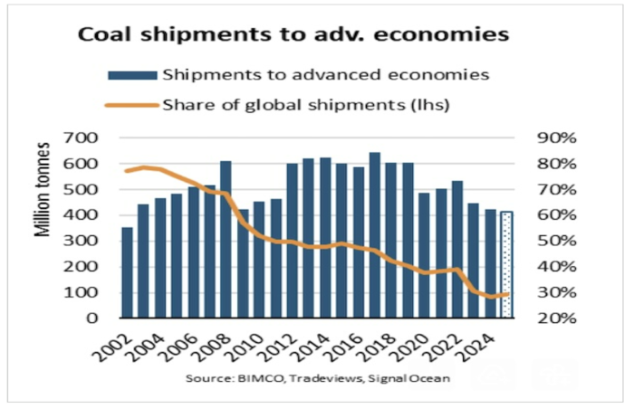 탈석탄 흐름이 구체화되면서 선진국으로 운송되는 석탄이 올해 2% 감소, 지난 23년래 최저치를 기록할 것으로 전망됐다.