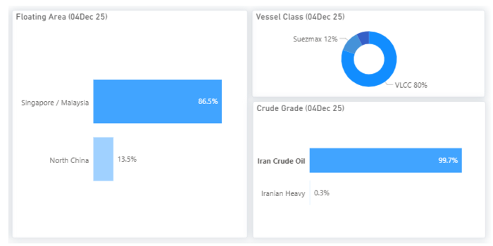 이란산 원유가 시장을 지배하고 있다. 보고서는 “부유식 저장의 약 99.7%가 이란산 원유이며, 그 중 80%는 VLCC에 집중돼 있다”고 밝혔다.