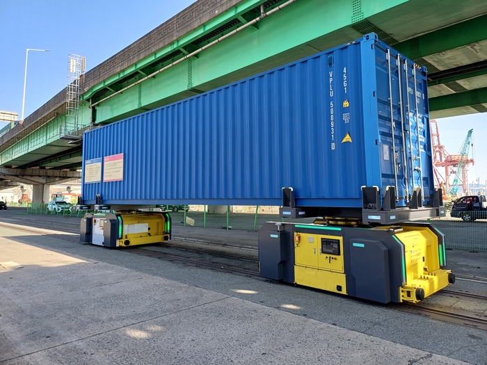 ‘환적화물 셔틀시스템’은 부산항 내 터미널 간 발생하는 타부두 환적화물을 2대의 셔틀을 이용하여 컨테이너를 무인자동방식으로 이송하는 궤도형 전기구동 이송장비 기술로 부산항만공사와 ㈜시스콘로보틱스가 함께 공동 개발했다.