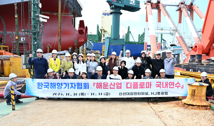 지난 31일 한국해양기자협회 소속 기자들이 찾은 HJ중공업 부산 영도조선소 안벽에 들어서자 거대한 해상 크레인이 위용을 뽐냈다. 이곳엔 대형 조선소의 상징과도 같은 골리앗 크레인은 없다. 대신 붉은색 해상 크레인이 바다를 미끄러지듯 가로지르며 무게 3000톤에 달하는 블록을 들어 올린다.