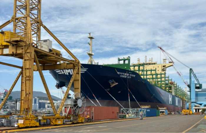 이날 조선소 한편에서는 HMM의 9000TEU급 컨테이너선이 시운전을 마치고 인도를 기다리고 있었다. 이 선박은 친환경인 메탄올 이중연료 선박이다.