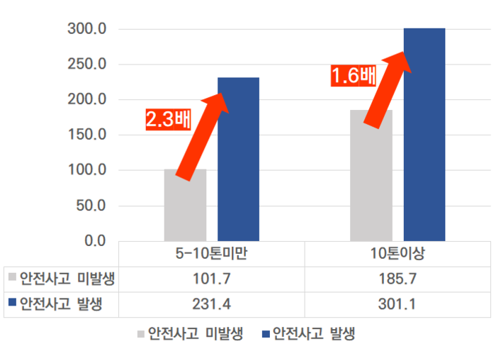 세부 톤급별로는 ▲5~10톤 미만 어선은 안전사고 발생 어선이 안전사고 미발생 어선보다 월평균 운항시간은 2.3배(102→231시간) 길고, 운항거리는 1.8배(580→1,021km) 많았다. ▲10톤 이상 어선은 안전사고 발생 어선이 안전사고 미발생 어선보다 운항 시간은 1.6배(186→301시간) 길고, 운항 거리는 1.5배(1,268km→1,958km) 많았다.