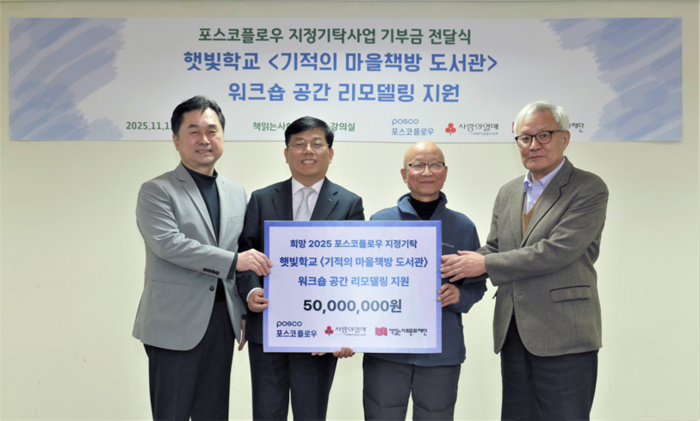 포스코플로우(사장 반돈호)가 충남 공주 지역에 위치한 햇빛학교 ‘기적의 마을책방 도서관’의 북스테이(Book Stay) 공간 리모델링 사업을 지원하며, 지난 12일 기증식을 진행했다.