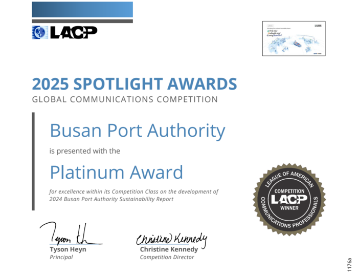부산항만공사(BPA, 사장 송상근)는 기관의 지속가능경영보고서가 미국커뮤니케이션연맹(LACP, League of American Communications Professionals)이 주관한 ‘2025 LACP 스포트라이트 어워즈(2025 LACP Spotlight Awards)’에서 세계 1위를 수상했다고 18일 밝혔다.