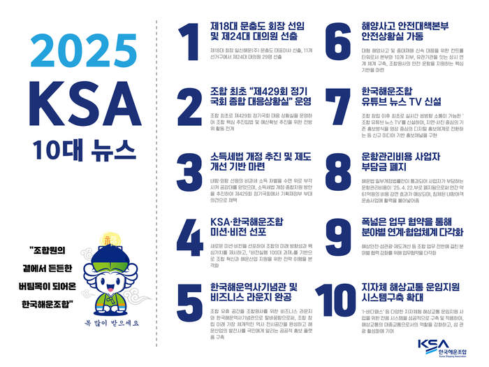 한국해운조합(이사장 이채익)은 2025년 을사년(乙巳年) 한 해를 마무리 하며 10대 뉴스를 선정했다. 조합이 선정한 ‘2025년 10대 뉴스’를 통해 주요 이슈들을 짚어본다.