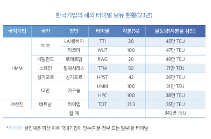 항만업계 관계자는 "해외 항만 운영권 확보는 커녕 매년 부산항 신항의 터미널 지분만 해외 선사들에 넘기고 있다"며 "국가 항만정책 자체를 재수립해야 한다"고 지적했다.