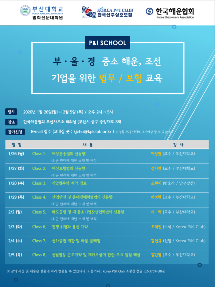 Korea P&I Club은 오는 1월 26일(월)부터 2월 5일(목)까지 부산 중구 중앙대로에 위치한 한국해운협회 부산본부 회의실에서 ‘부·울·경 중소 해운, 조선 기업을 위한 법무/보험 교육 (P&I SCHOOL)’을 개최한다고 밝혔다.