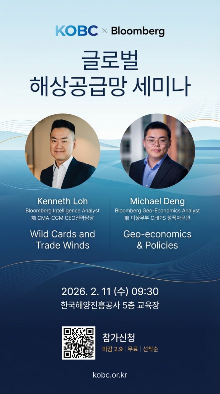 첫 번째 세션에서는 블룸버그 인텔리전스 분석가 케네스 로(Kenneth Loh)가 연사로 나선다. 글로벌 해운사 CMA-CGM에서 전략 매니저를 담당한 그는 풍부한 실무 경험을 바탕으로, 해운 시장의 불확실성 속에서 나타나는 주요 위험과 기회 요인을 분석할 예정이다.