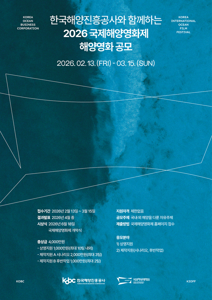 한국해양진흥공사는 국제해양영화제 조직위원회와 함께 이달 13일부터 다음 달 15일까지 ‘한국해양진흥공사와 함께 하는 2026년 국제해양영화제 해양영화 공모전’을 진행한다고 밝혔다.