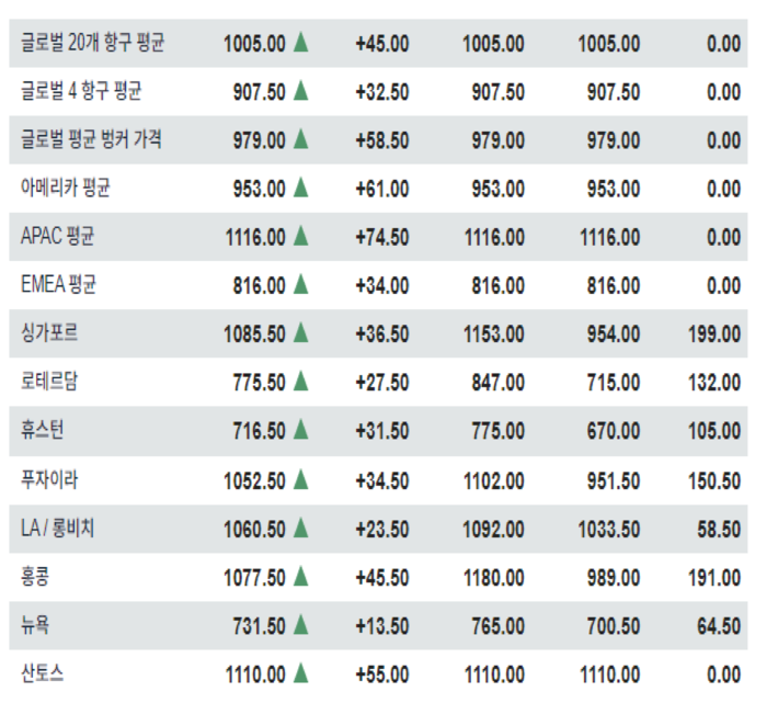 대조적으로 미국 동안 및 유럽 항만에선 벙커 공급이 상대적으로 안정적으로 진행되면서 낮은 수준에 가격이 형성됐다.