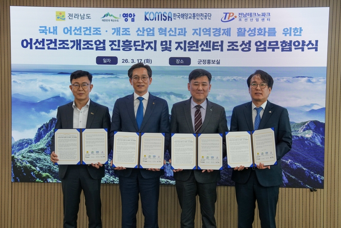한국해양교통안전공단(KOMSA, 이사장 김준석)은 17일 전라남도, 영암군, (재)전남테크노파크와 ‘국내 어선건조·개조 산업 혁신과 지역경제 활성화’를 위한 4자 간 업무협약을 체결했다.