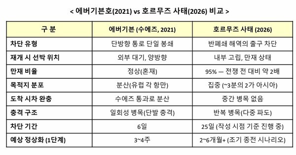 그는 또 “지난 2021년 에버기븐호 사고로 수에즈운하가 봉쇄될 당시, 6일간 차단으로 약 3~4주간 시장 혼란이 유발됐는데, 이를 호르무즈 사태에 적용하면 최소 60~100일 정도의 정상화기간이 소요될 것으로 보인다”고 지적했다.
