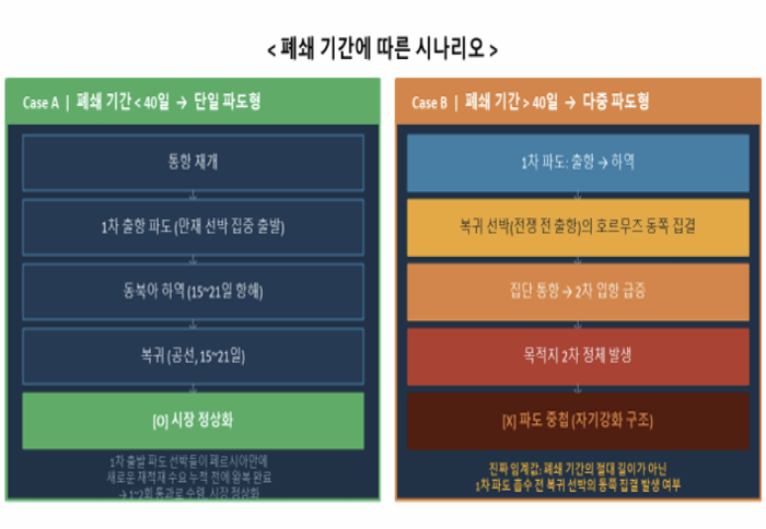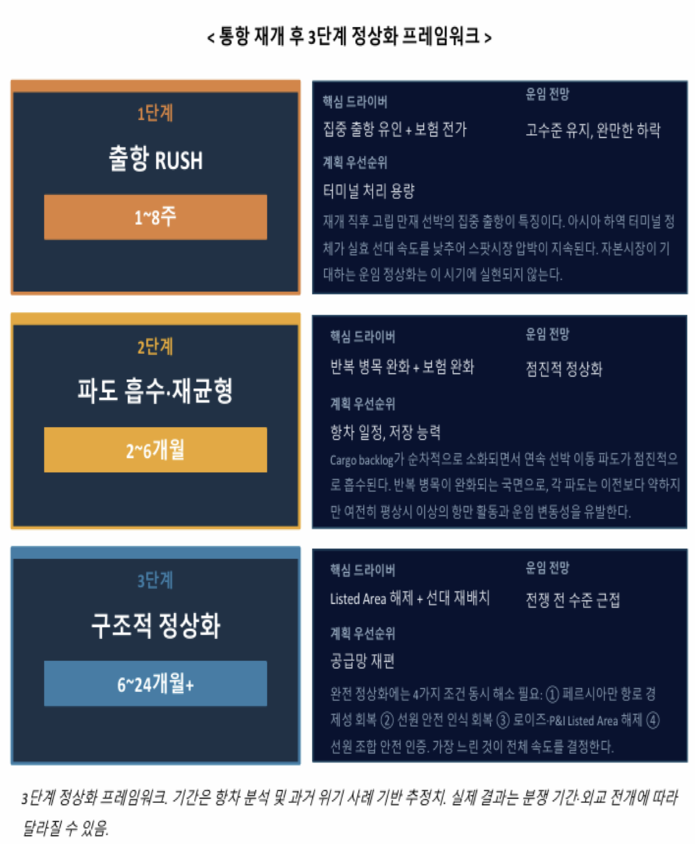 1~8주까지는 집중 출항에 따른 ‘출항 러시’ 단계, 2~6개월은 반복 병목이 완화되는 ‘파도 흡수’ 단계, 6~24개월 이상은 위험 구역 지정 해제와 선대 재배치가 이뤄지는 ‘구조적 정상화’ 단계다. 특히 완전한 정상화는 외교적 선언만으로는 불가능하며 사고 없는 통항 데이터가 충분히 누적돼야 보험료가 내려가는 등 실질적인 회복이 가능할 것으로 전망했다.