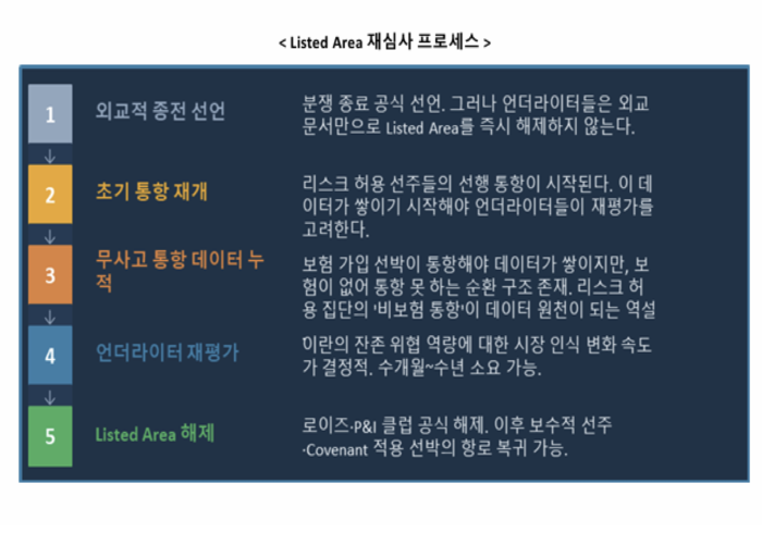 현재 호르무즈 해협은 위험 구역으로 지정돼 전쟁위험 보험료가 급등한 상태다. 종전 직후 리스크를 감수하는 일부 선주들이 고운임을 노리고 초기 ‘출항 러시’를 주도하겠지만, 보수적인 선주나 금융 계약상 제약이 있는 선박들은 보험 정상화가 확인될 때까지 관망세를 유지하며 ‘이중 운임 시장’을 형성할 것으로 분석됐다.