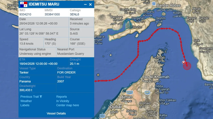 선박 위치정보(AIS)서비스 업체 Pole Star Global에 따르면 28일 일본의 VLCC '이데미추 마루(Idemitsu Maru)호'(30만 433DWT급, 파나마 선적)가 아라비아만에서 호르무즈 해협을 거쳐 외해로 이동했다.